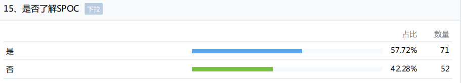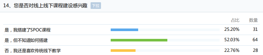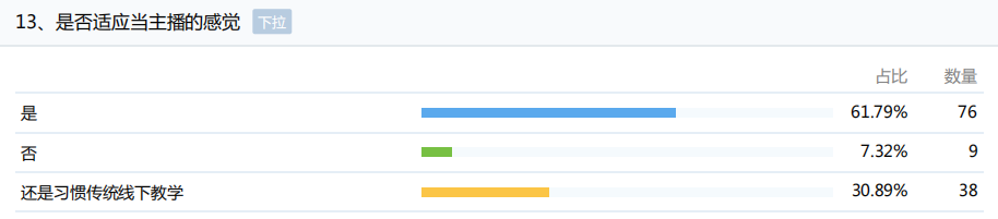 从数据统计看,84.55%的教师对线上教学平台的运行状态满意;61.79%的教师对当主播的感觉良好;57.72%的教师了解线上线下课程,超过77.24%的教师对课程建设感兴趣。这些数据说明,教师并没有过度依赖传统的与学生面对面的教学模式,对线上教学的接受度良好,并且具有建设线上线下课程的热情和需求。