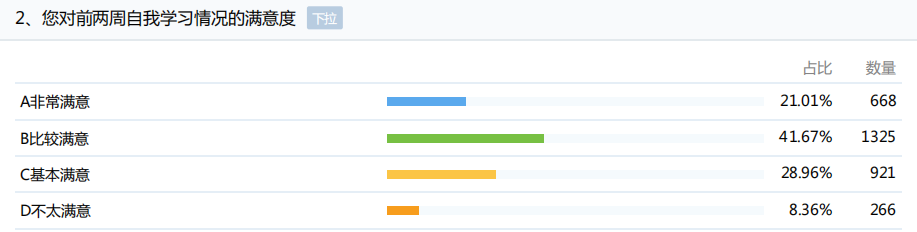 学生对自我学习情况满意度调查,非常满意占21.01%,比较满意占41.6%。
