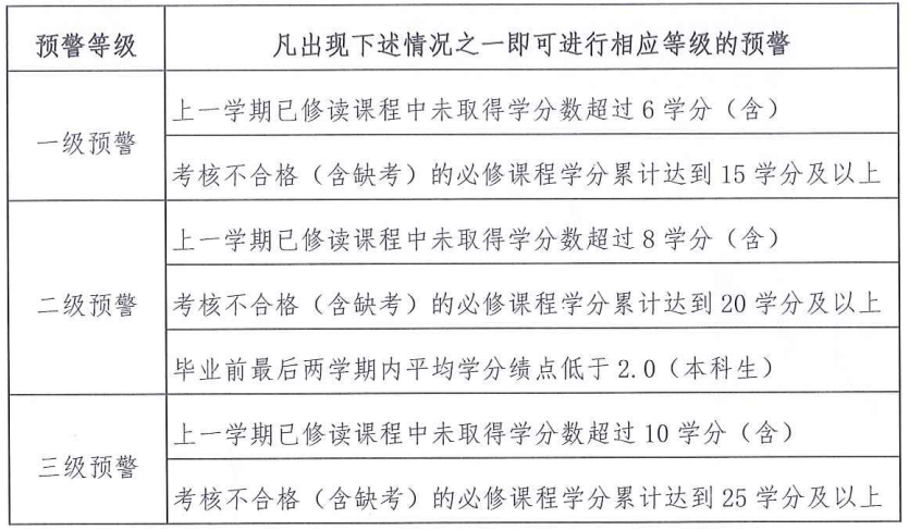 1.学业预警工作按学期进行,每学期补考结束后由各学院根据学生学业情况,采取相应预警办法,教务处、学生工作处负责检查督促。
